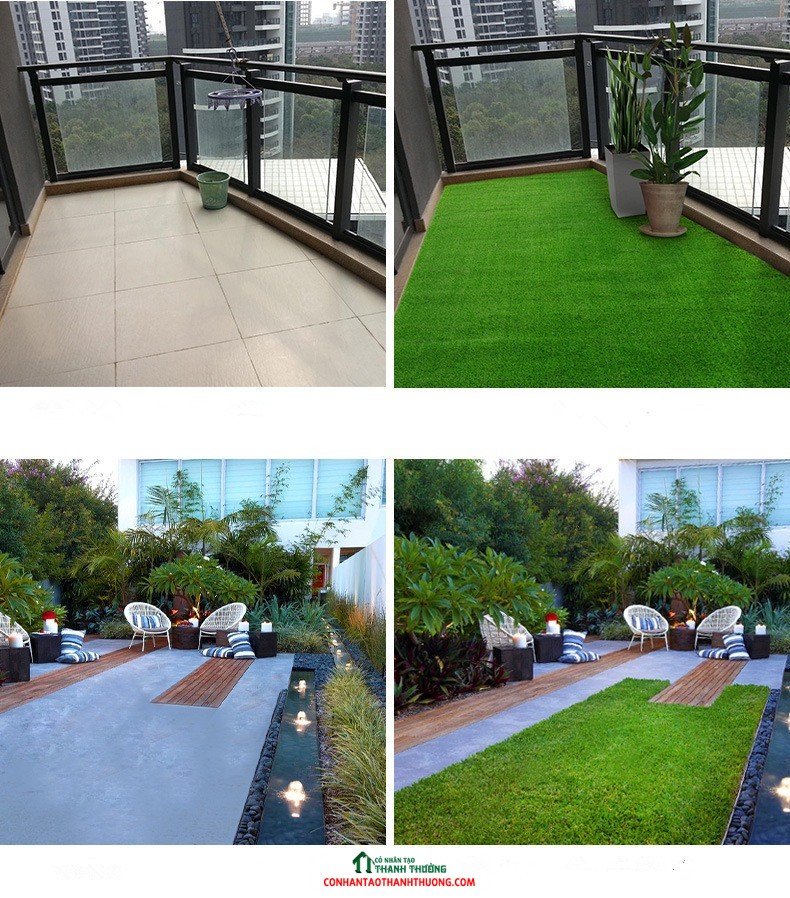 Đối với không gian sân vườn, cỏ nhân tạo sẽ là vật liệu giúp bạn bớt mệt nhọc bởi những đặc tính ưu việt như không cần chăm sóc, tưới nước, bón phân mà vẫn xanh tốt, cỏ nhân tạo đã thực sự đi vào mọi mặt của cuộc sống. Không những thế, nó còn có độ đàn hồi tốt, độ bền cao và kháng thời tiết nên phù hợp với mọi môi trường. Gia đình bạn có thể vô tư vui đùa trên cỏ mà không sợ cỏ chết ảnh hưởng đến mỹ quan.